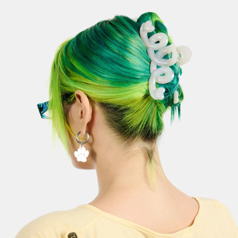 This limited edition set features a playful loopy hair claw and a matching wide-tooth angel wing comb, both in a white iridescent finish. Presented in charming, gift-ready packaging, the durable acetate wide-tooth comb is perfect for gently detangling hair, while the large hair claw provides a secure non-slip hold for creating various effortless updos for most hair types.