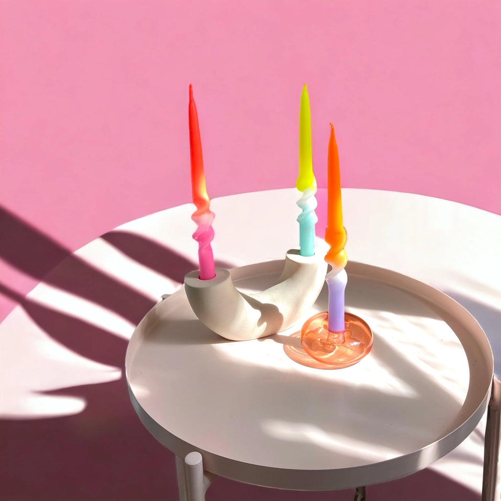 Set of three lovingly hand-dyed, hand-turned stick candles in neon look. The colors remain the same, the pattern gradients vary with each candle and make them a special one-of-a-kind. Packed in a high quality pink cardboard box with embossed writing in gold. Carefully selected paraffin - regionally colored in Bavaria/Germany and 100% vegan. Due to the twisted shape, unfortunately, for physical reasons, you can never exclude the possibility that these candles drip.