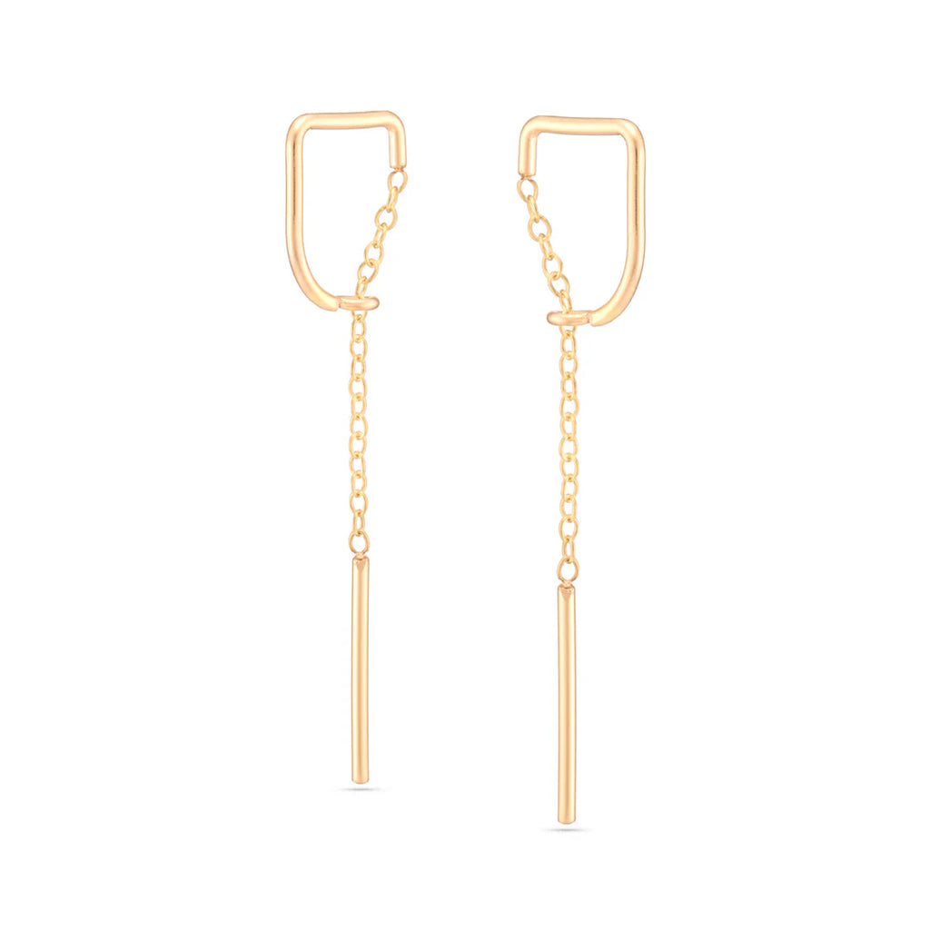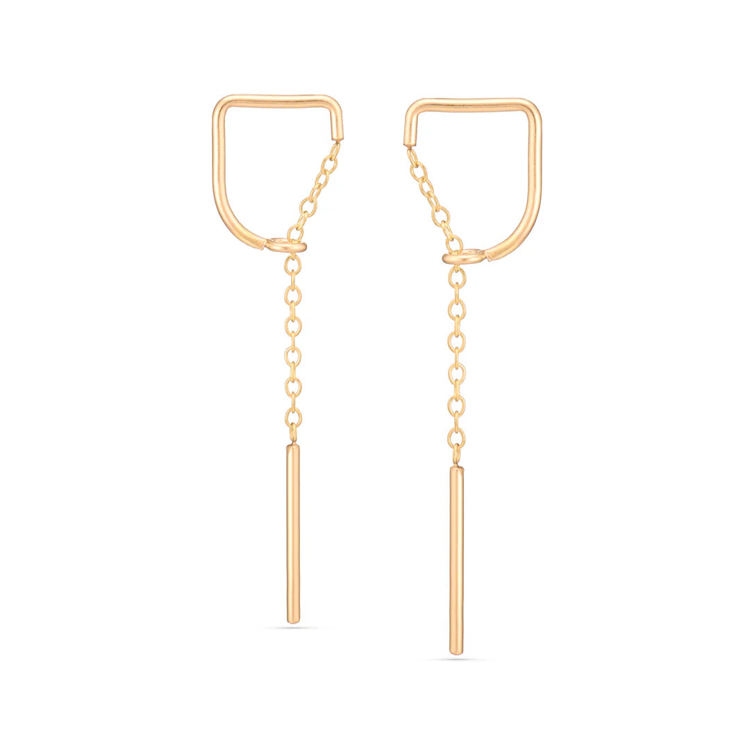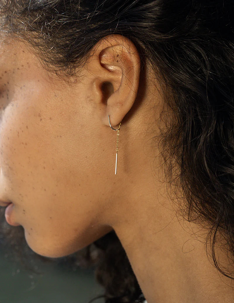 A little swing, a little shine — Giddy-up! The Rodeo Earring is made to move with you. Featuring a sculptural U-shaped hoop paired with a delicate chain and sleek bar that drops through a tiny ring, this design blends structure with fluidity. Lightweight and comfortable, it adds just the right amount of playfulness to a minimal silhouette, making it perfect for everyday wear or a subtle statement at night.