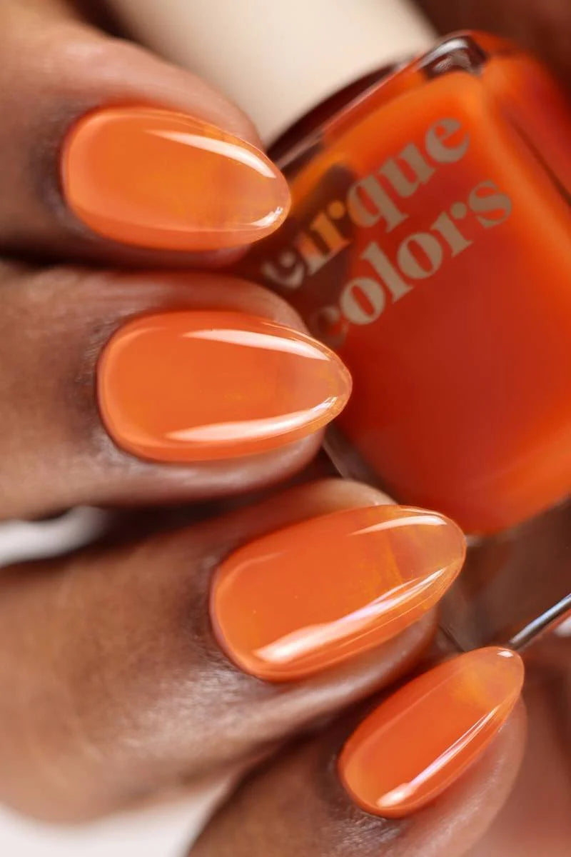 Amber Jelly is a deep orange jelly nail polish with a shiny, transparent finish. Our jelly polishes feature a sheer, buildable formula giving the color depth and allowing your natural nail line to peek through.