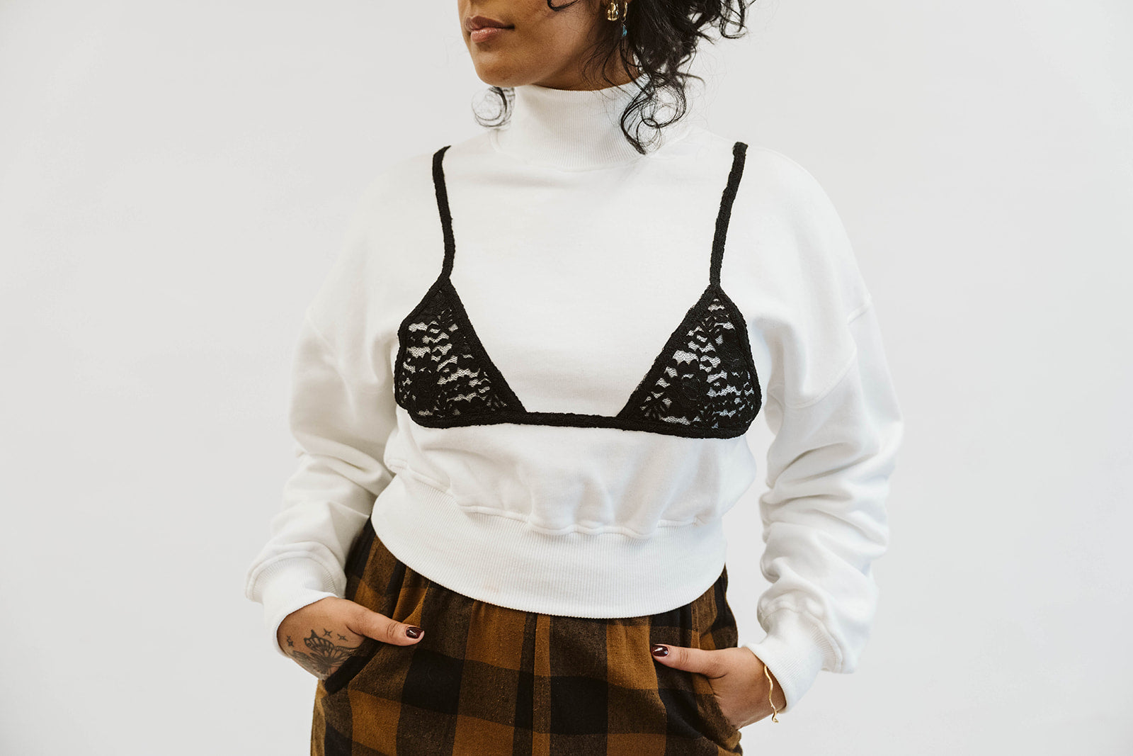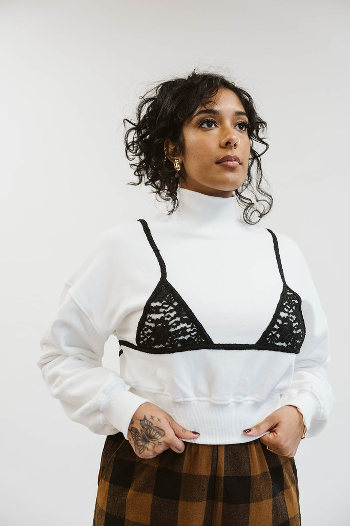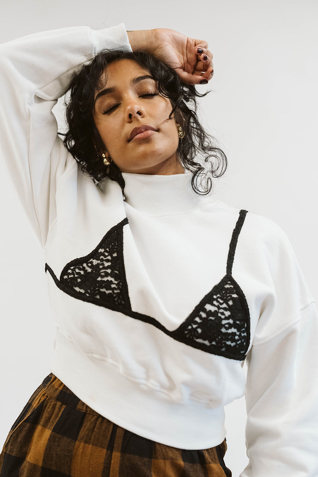 Cute cropped 100% cotton sweatshirt with a lace "bra" applique on the front and back