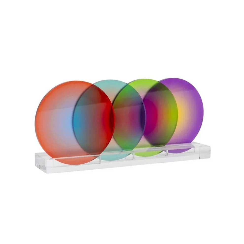 The Gradient Coasters are a set of four acrylic coasters designed by London-based graphic artist Yoni Alter, complete with a clear display stand. Produced in Portugal (and London-sourced), each coaster measures approximately 4″ (9 cm) in diameter and features a gradual color shift—creating a sculptural, playful setup whether stacked or displayed. Coated with a protective micro-layer, they make a visual statement whether used under drinks or left on view. Ideal for style-conscious desktops, modern dining tables, and art-minded gift recipients.