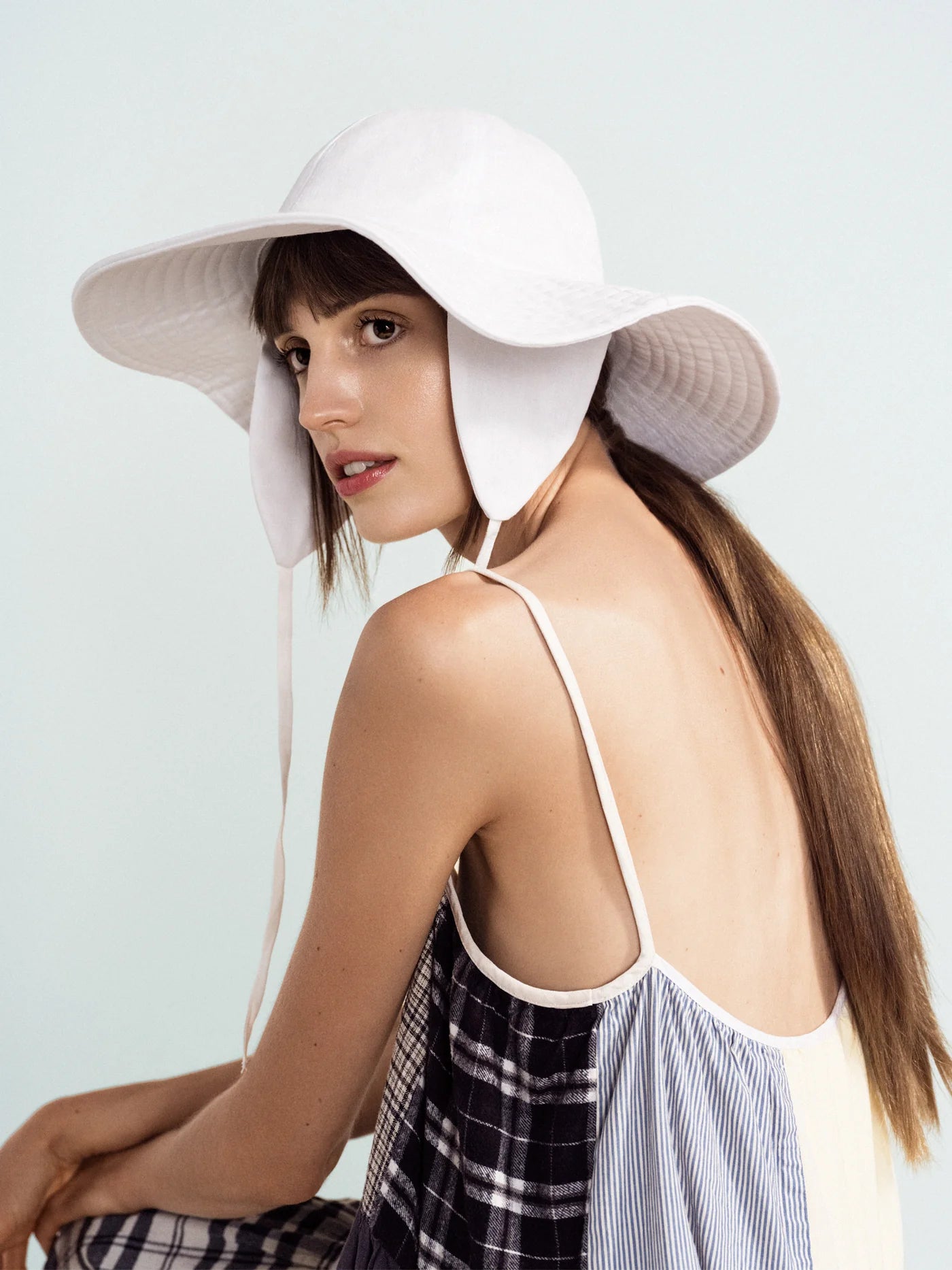 Shield yourself from the sun with this stylish summer hat that features wide brim and protective side panels. It's perfect for strolling around town or lounging on the beach - keep those rays at bay!