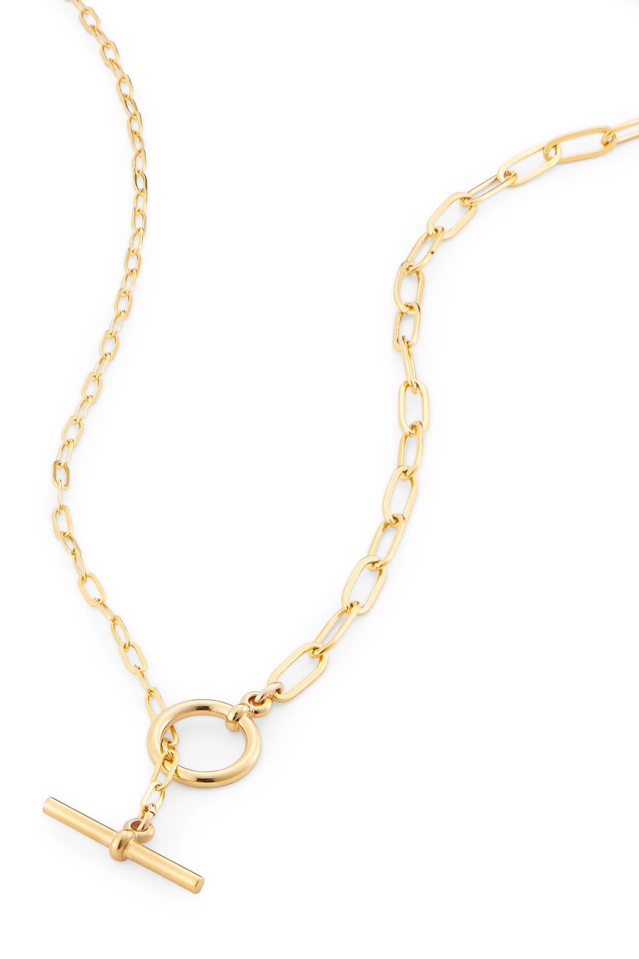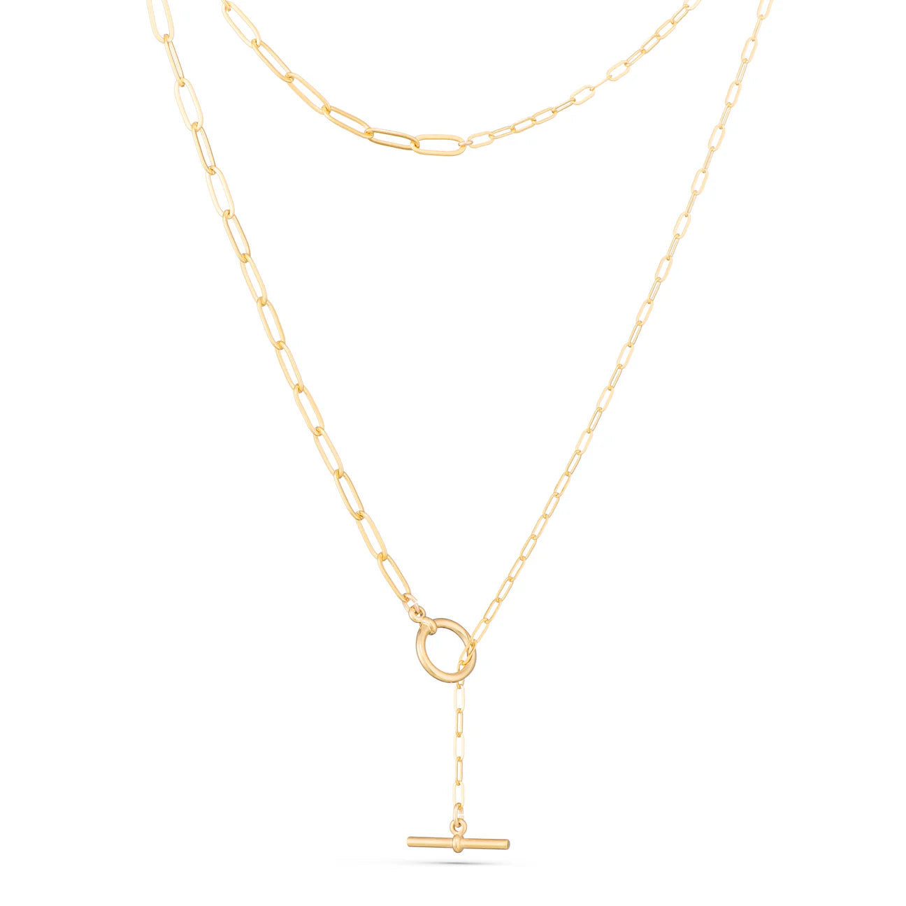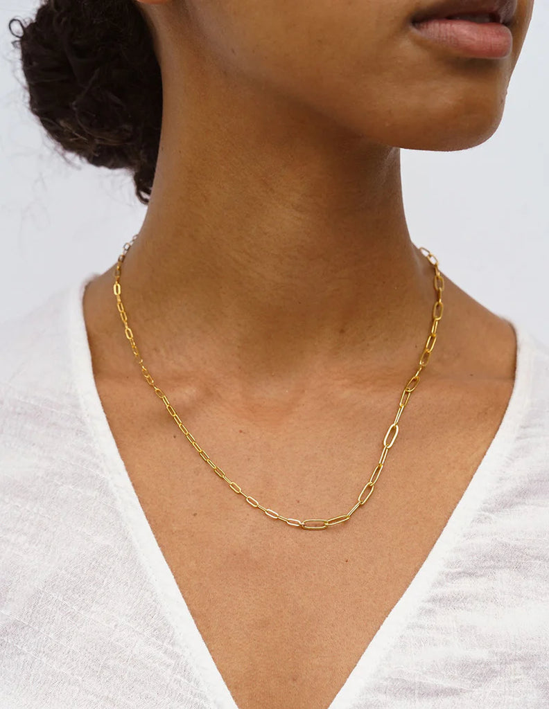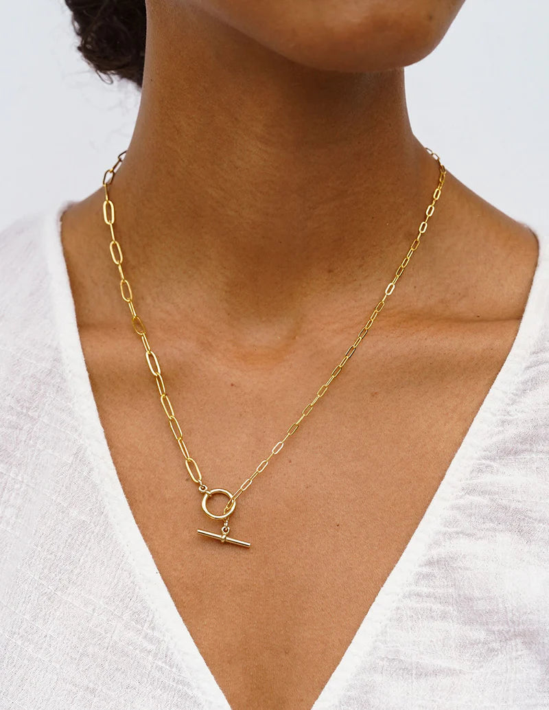 Sometimes all you need is a fun chain to add a little shine and complete your look. The Mix Mix clasp also looks great worn in front as a focal point and for a little added flair pull the T-bar through and turn it into a lariat.