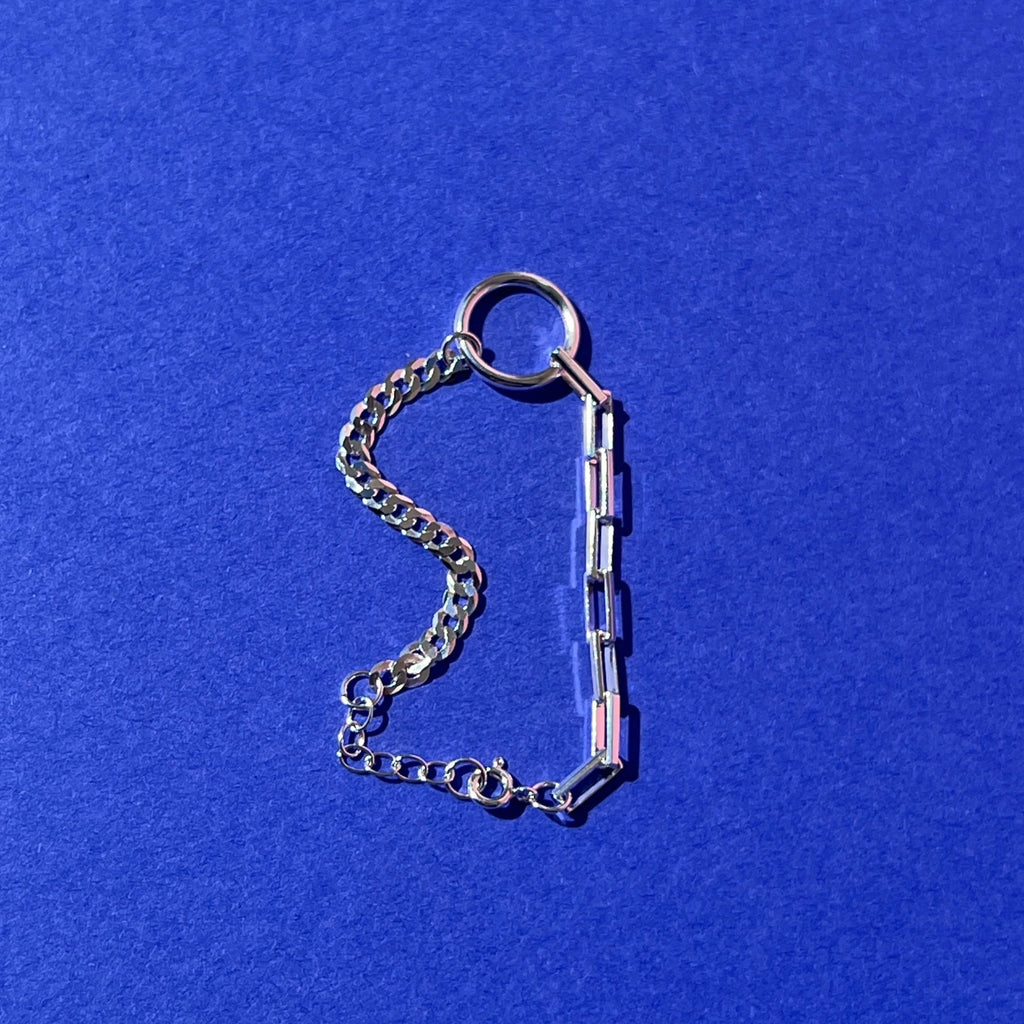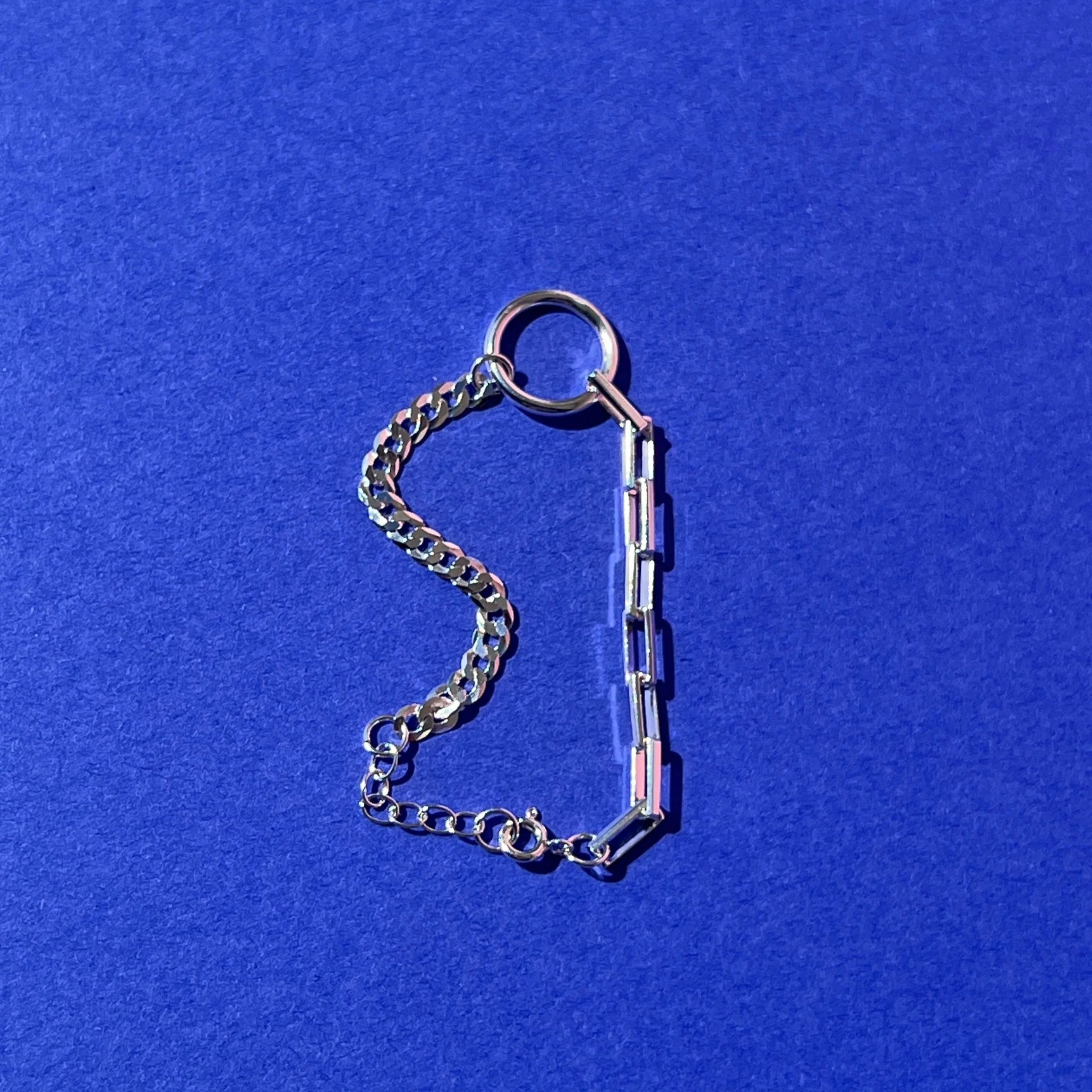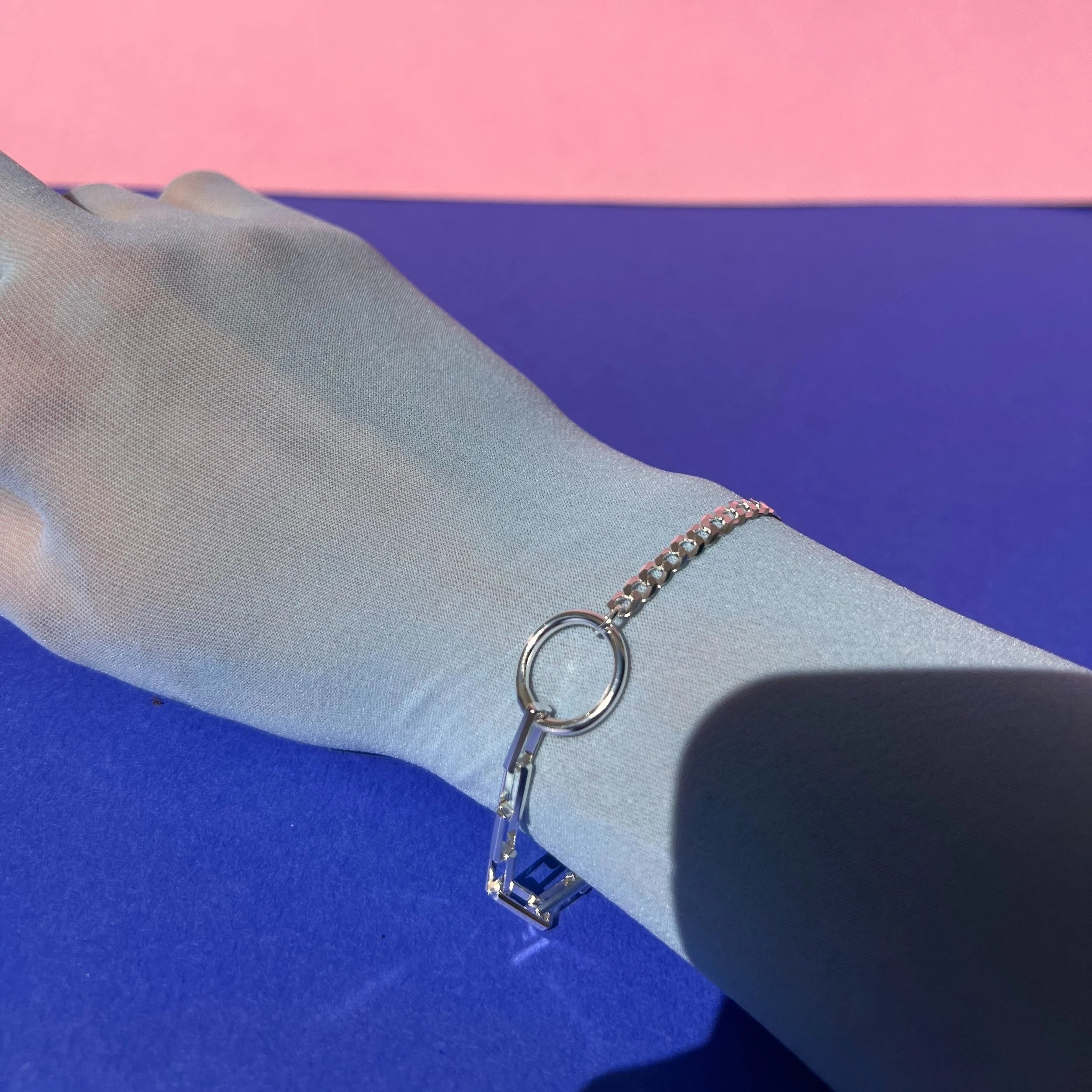 Sterling Silver bracelet featuring a central O-ring with a mix of box chain and curb chain. 7.25" long including a 1" adjustment and fastened with a ring clasp.