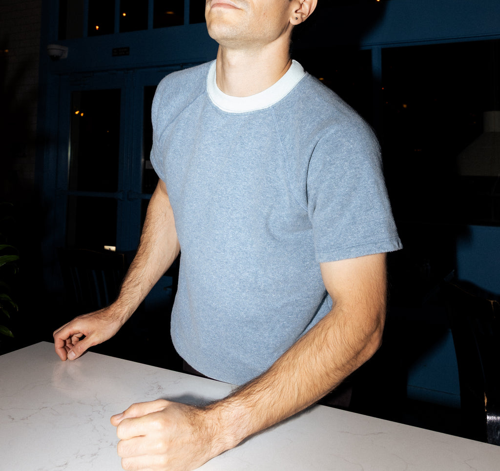 - Straight raglan sleeves that hit just above the elbow; sleeve cuff does not taper in