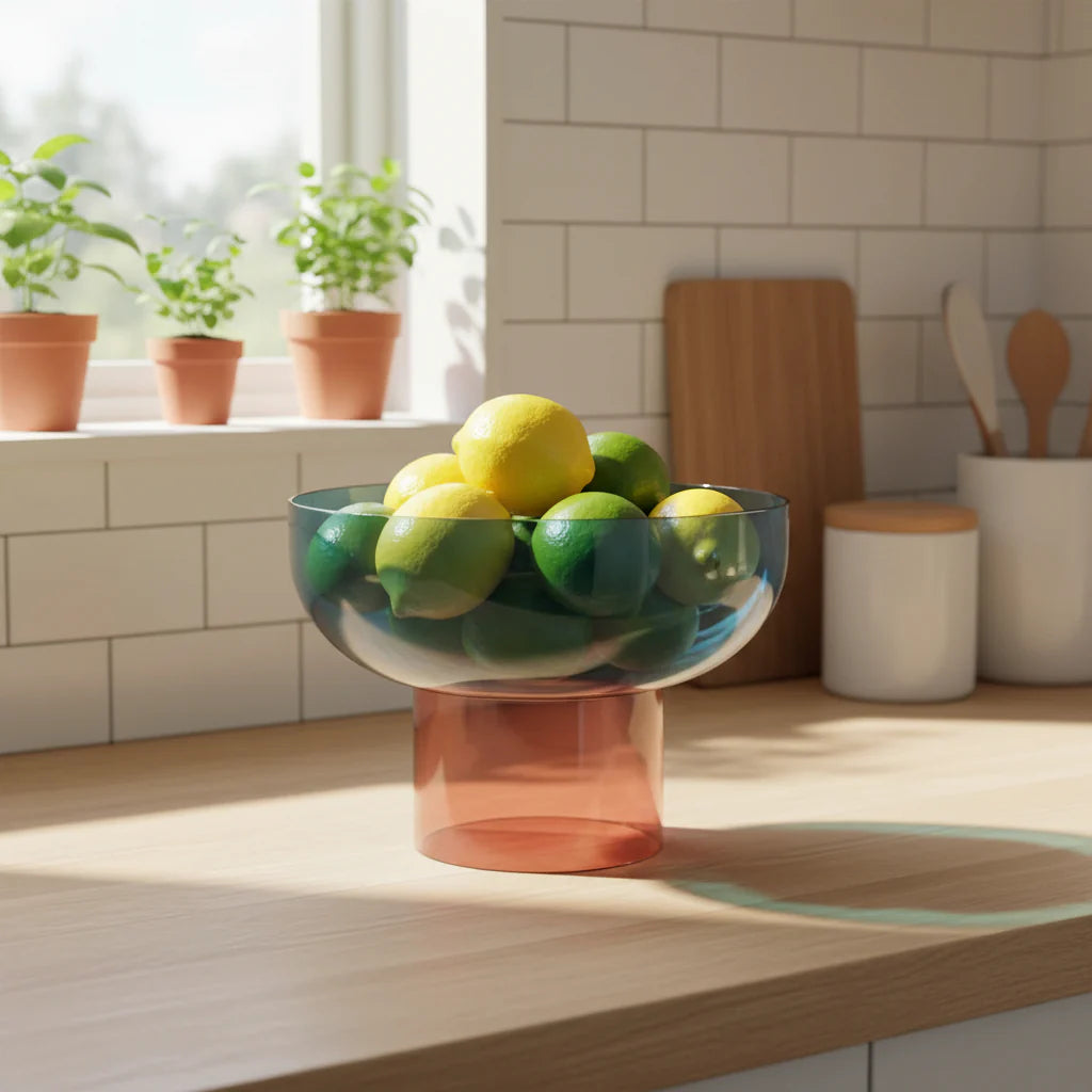 A vibrant blue bowl on a pink base that's perfect for displaying your fresh fruit.