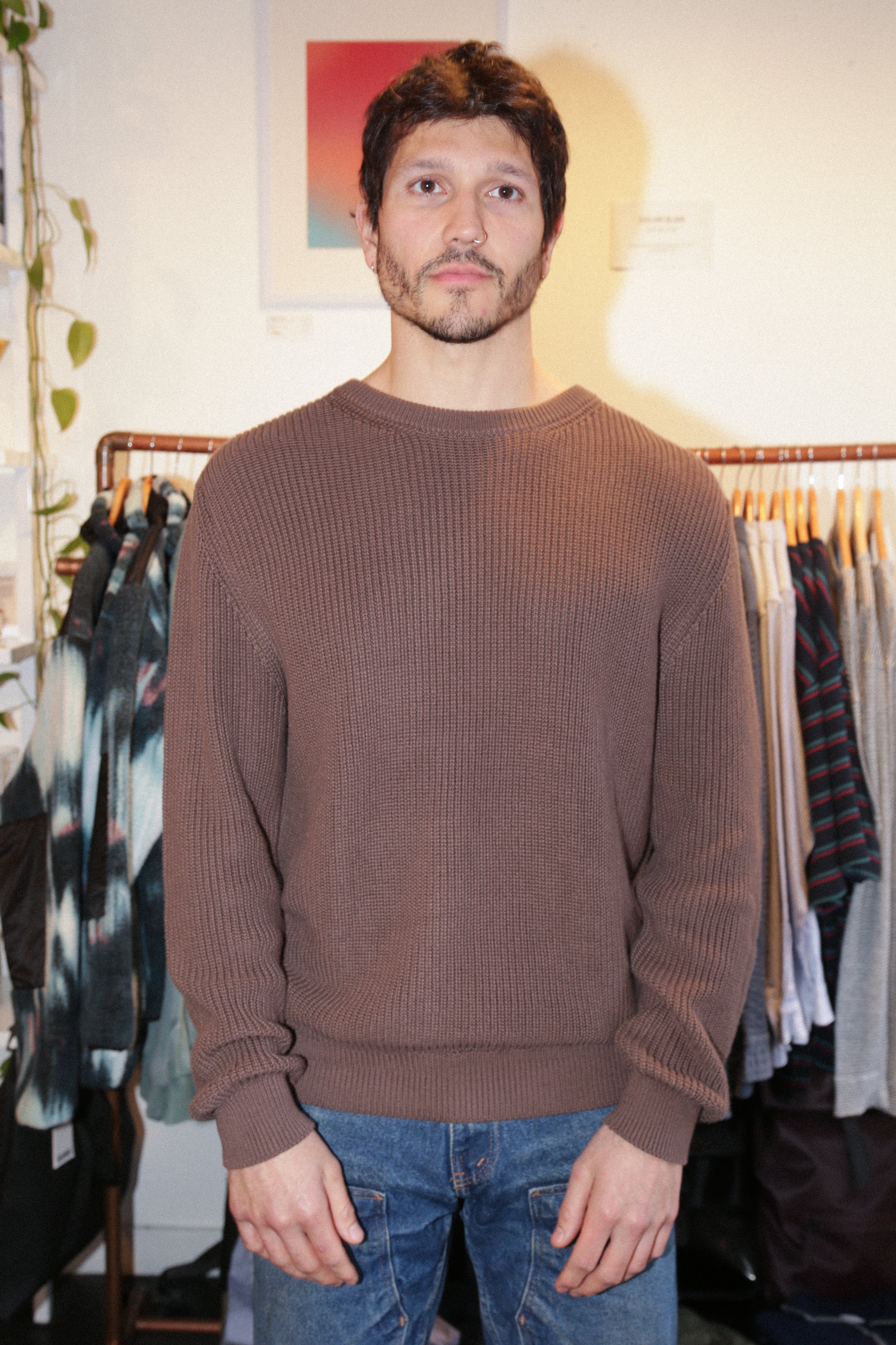 A chunky cotton sweater knit with Coffee Brown yarns in 100% organic cotton.