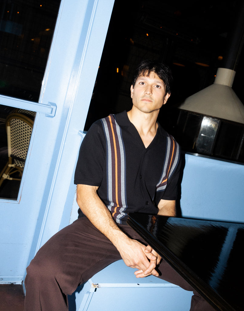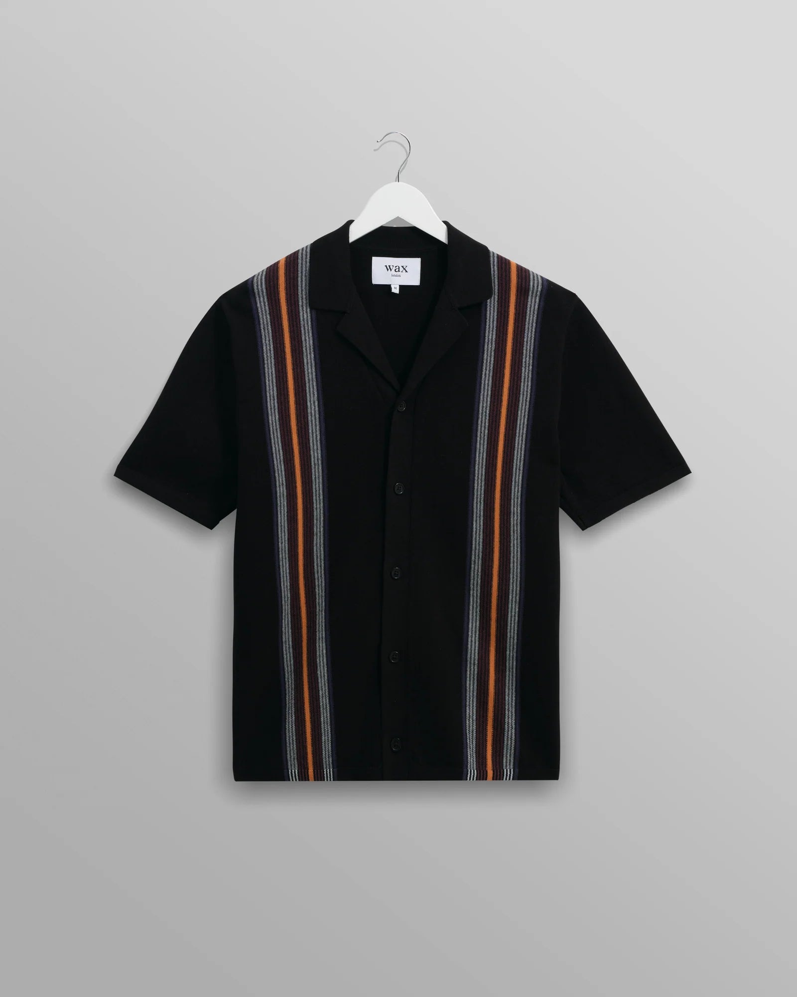 The Ivy shirt is a contemporary spin on the preppy classic. Cut for a relaxed fit from 100% knitted cotton, this button-through polo features a multicolour textured stripe design against a deep black base. Finished with a revere collar, it nods subtly to the charm of 50s bowling shirts.