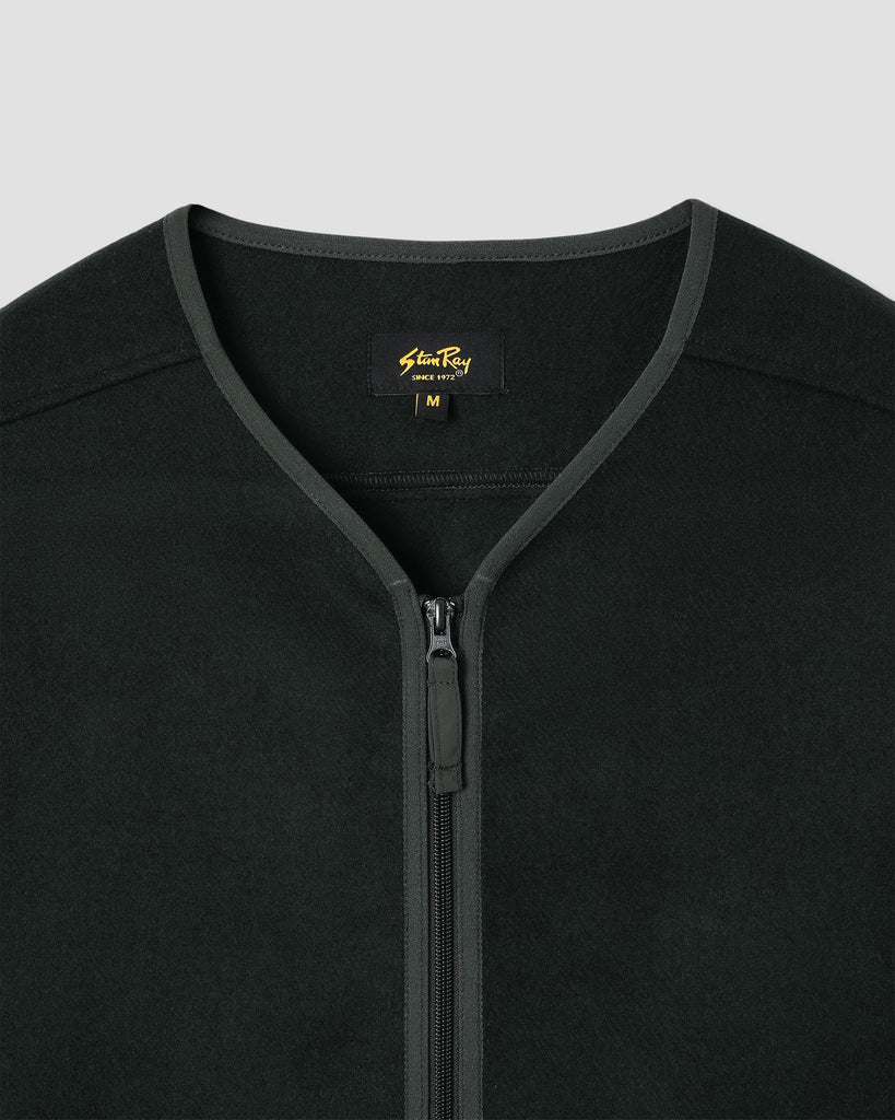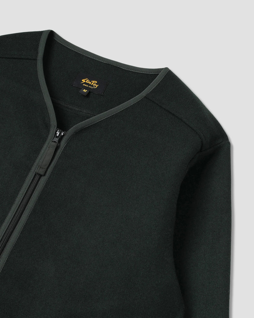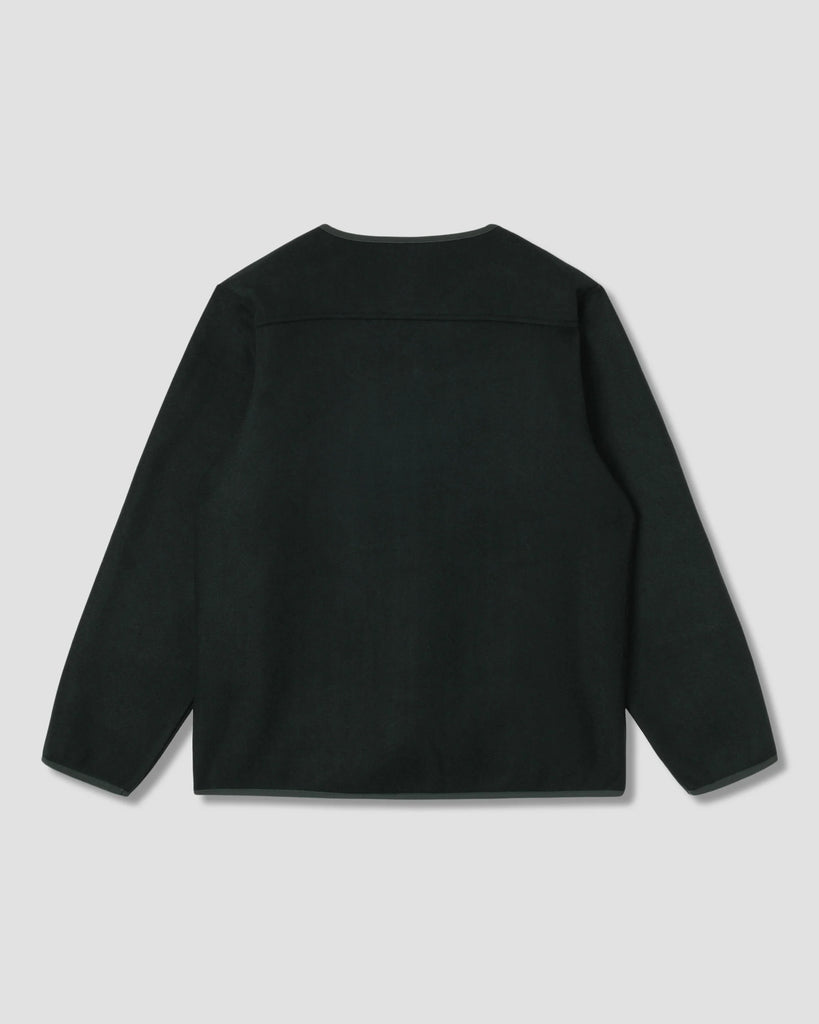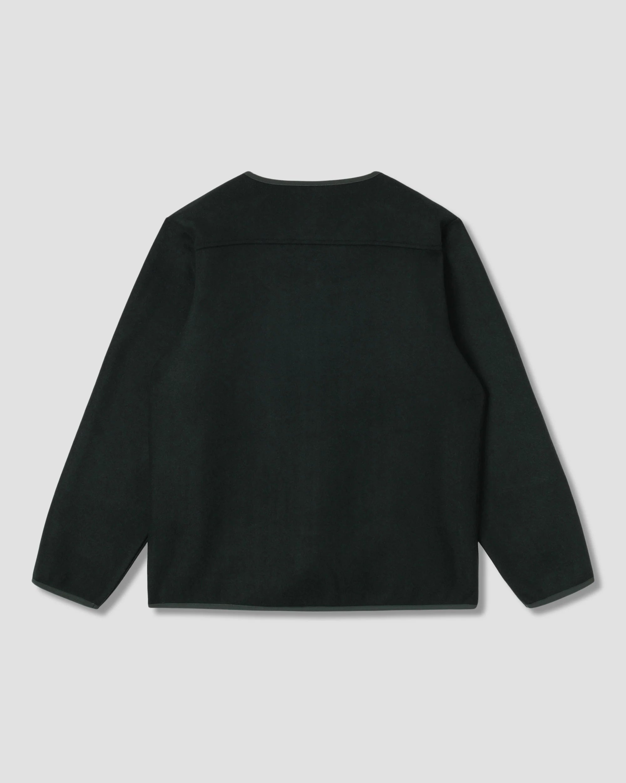 A hardwearing and practical wool fleece cardigan, available in dark red, navy heather, and botanical green. Also offered in matching jacket and vest styles.