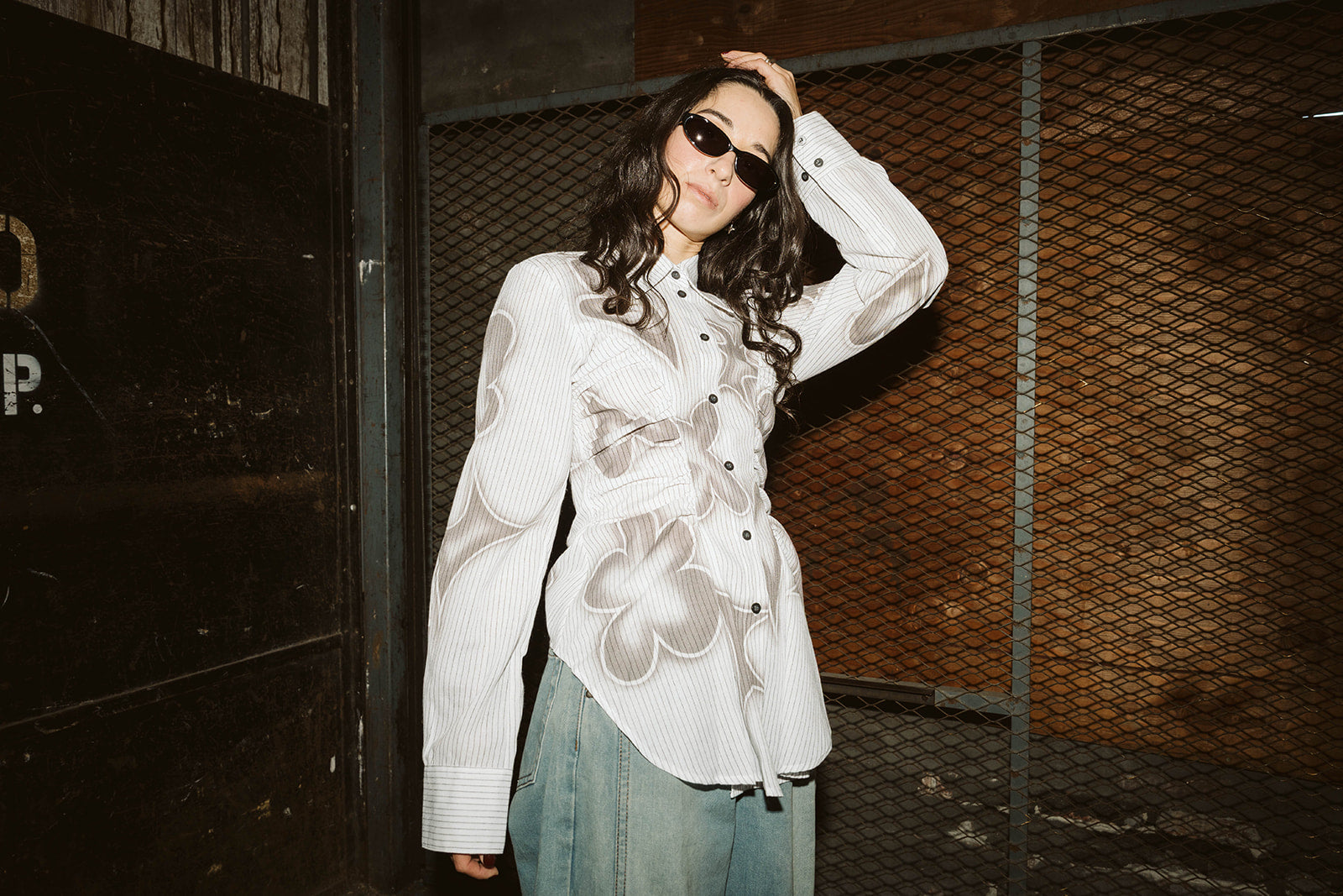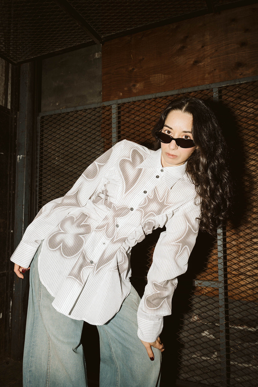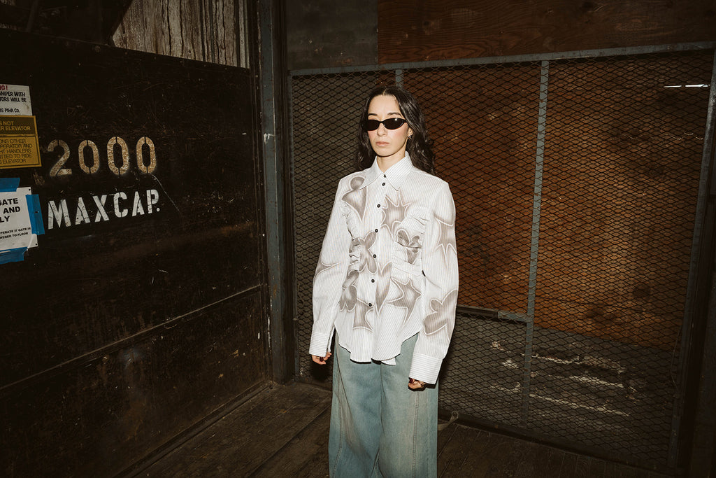 Shirt with gathered detailing at the bodice for a sculpted, flattering shape. Fitted through the waist with subtle volume through the hem and sleeve. Crisp, lightweight cotton shirting with a tonal pinstripe pattern. Classic button-down collar with full front placket closure. Finished with Arthur's signature stencil digital print!