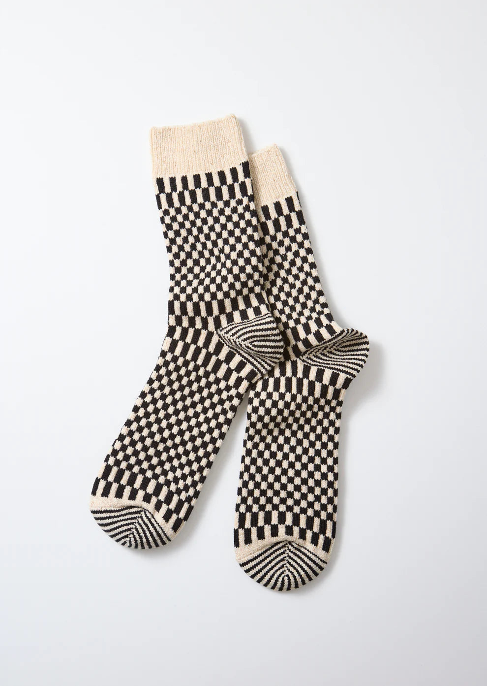 Checkerboard-patterned socks with a moderate thickness for everyday comfort. Knitted using a jacquard technique that minimizes loose yarns on the inside, reducing bulk and ensuring a smooth, comfortable fit