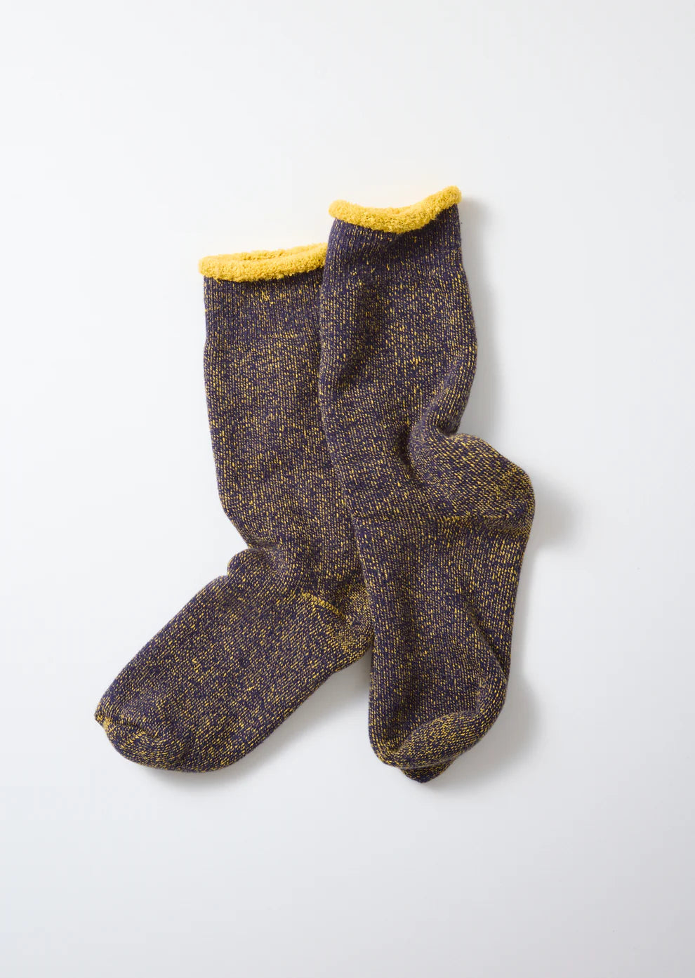 As the name suggests, these pile socks are fully reversible and can be worn inside out. The design is inspired by reversible college T-shirts from the 1970s. Each pair features contrasting cotton yarns on the inside and outside for a distinctive two-tone look.