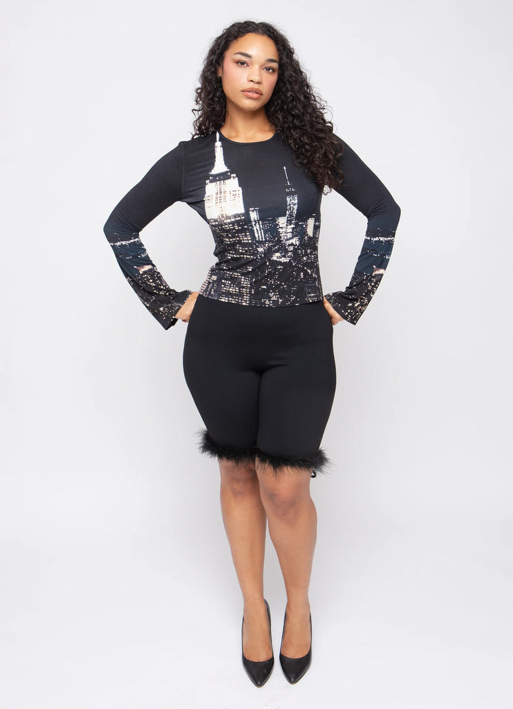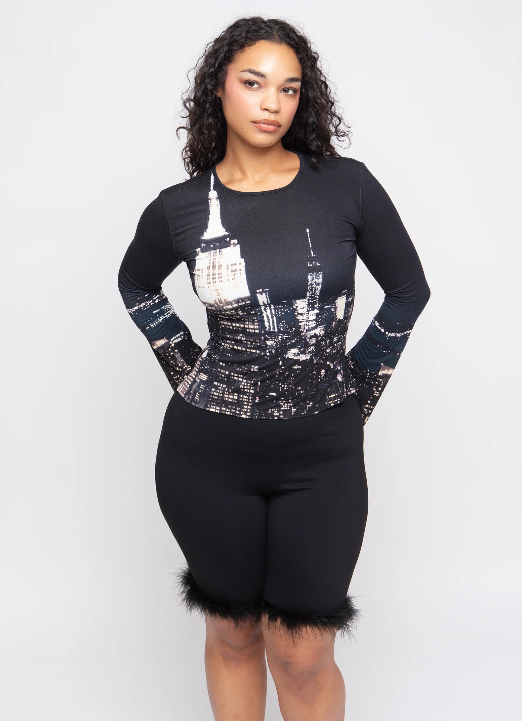 Our favorite glimmering cityscape is rendered in a glowy subdued neon and digitally printed across the body. This long sleeve has the perfect crew neck and is cut in a super slinky and soft modal jersey.