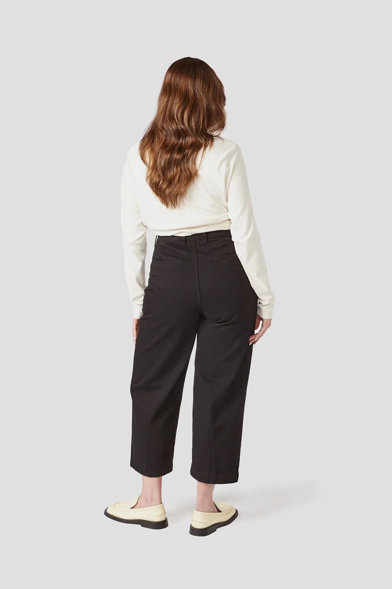 Decade Studio's best-selling pant, known for its cool, relaxed silhouette and subtly sculpted barrel leg. Cropped at the ankle with single-welt back pockets and a classic button fly, it’s polished, comfortable, and endlessly wearable. Cut from breathable 100% cotton denim that softens beautifully with wear and finished with our signature custom hardware.