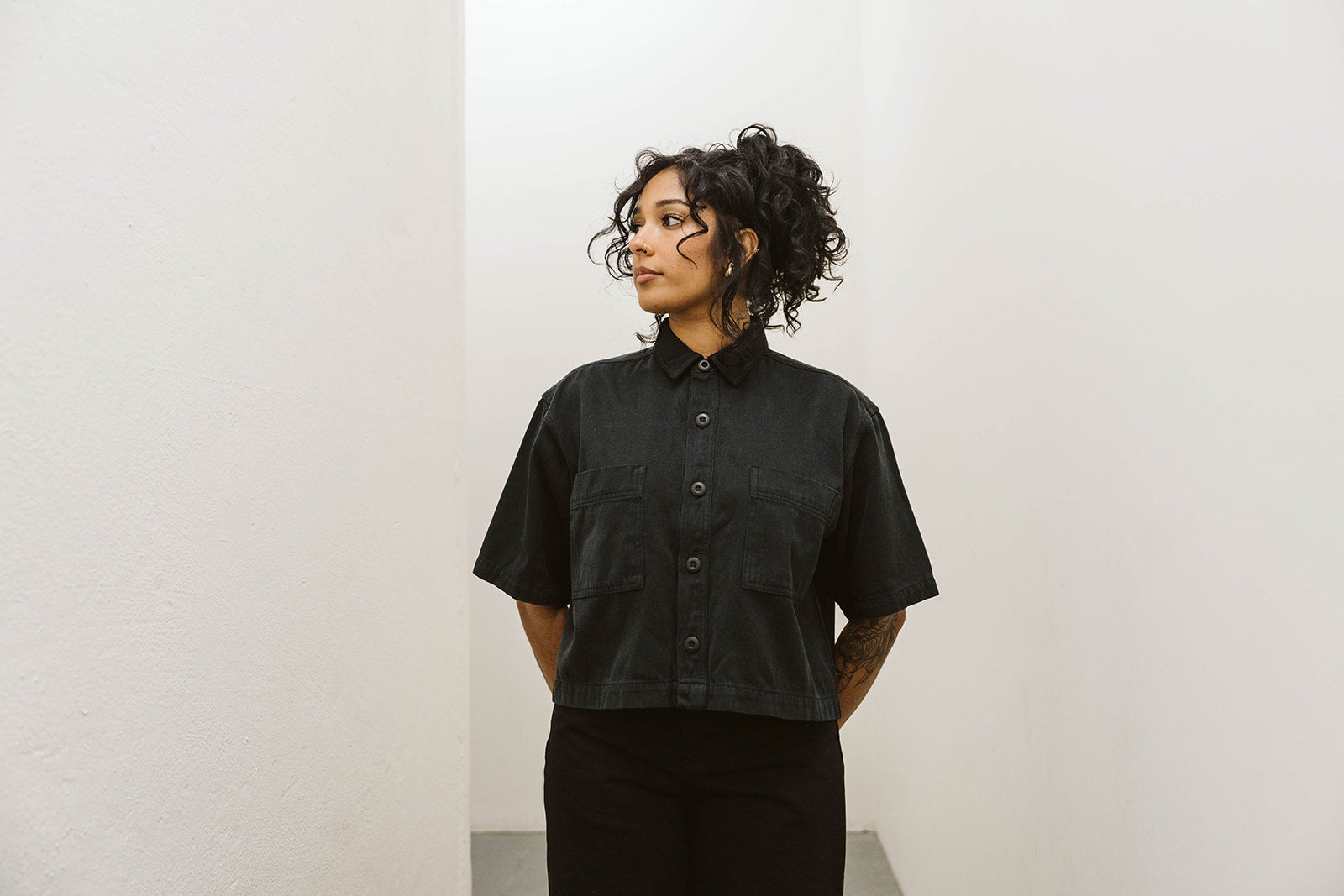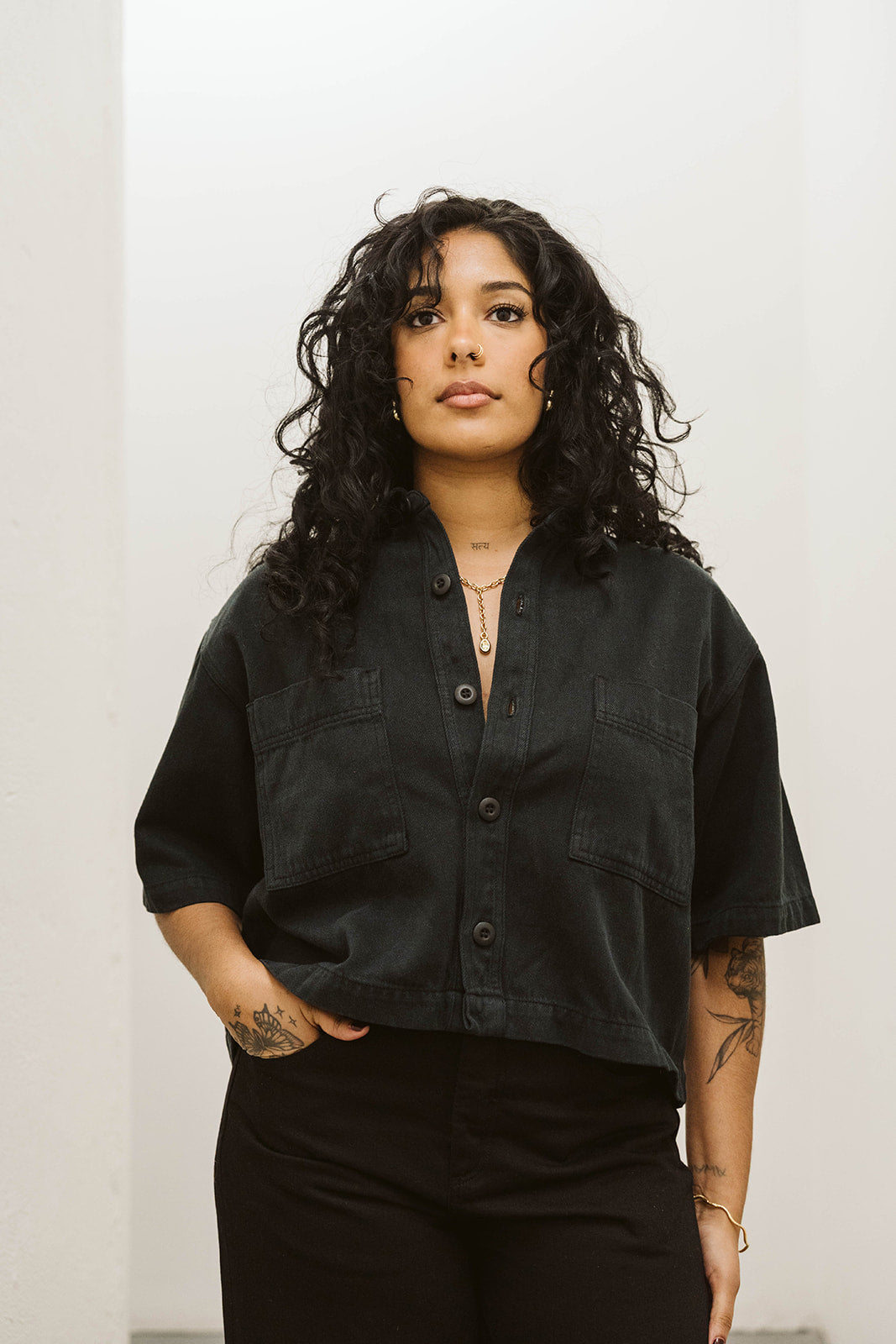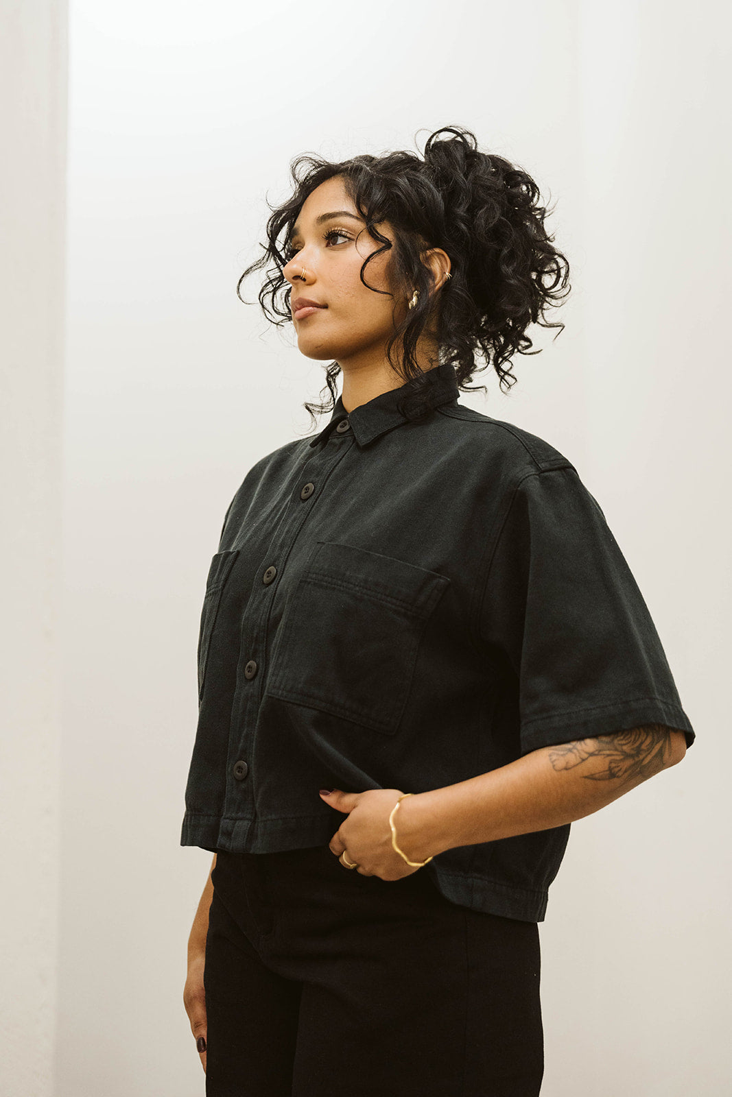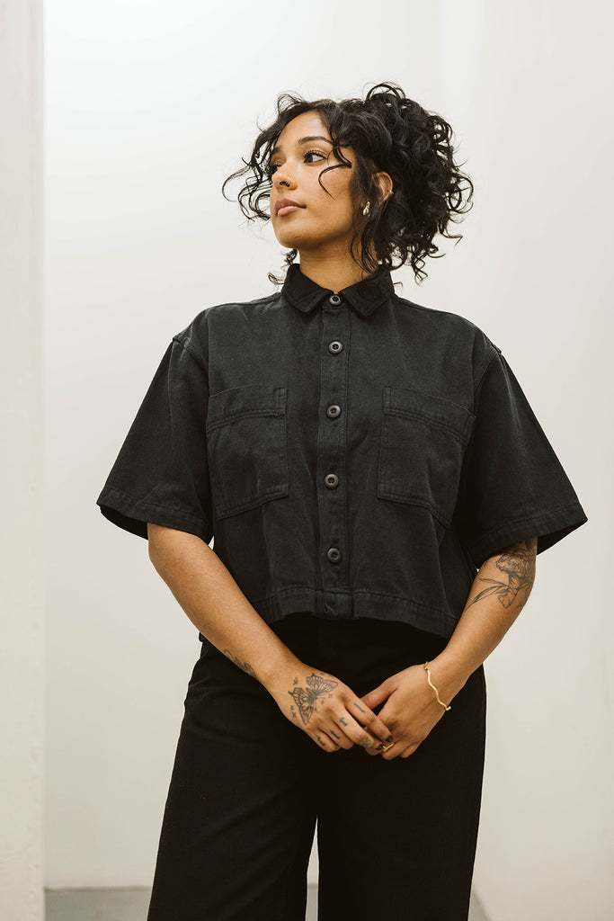 With that classic boxy cropped fit, this shirt looks great with high waisted bottoms or unbuttoned over a tank or bathing suit.